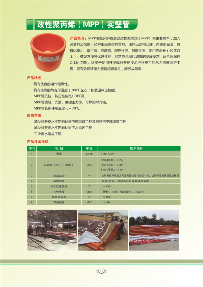 MPP電統保護管是以改性聚丙烯(MPP)為主要原料,加入必要的添加劑,經擠出而成型的管材。該產品結構合理,內表面光滑,具有比重小、造價低、強度高、耐熱性強、耐磨性強、使用壽命長(50年以上)、敷設方便等優越性能,非常符合現代城市的發展要求,適合埋深在2-18m范圍。適用于使用開挖或非開挖技術進行施工的電力電纜保護工程,可有效保證電力管網的可靠性,降低故障率
